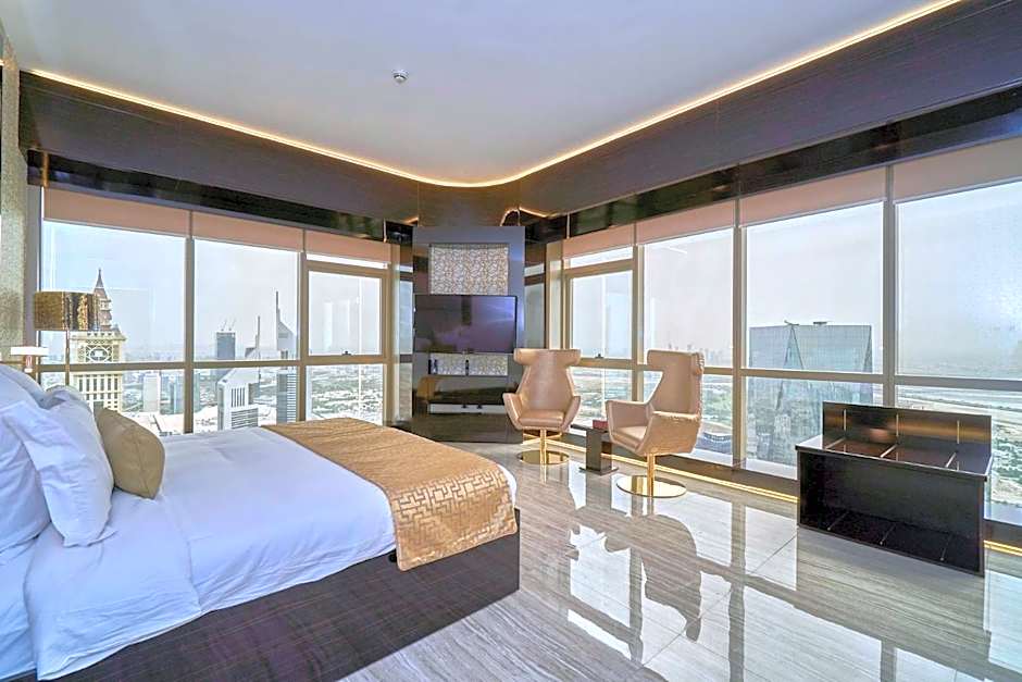 This luxurious suite is located on the 72nd Floor and comes with 5 well-appointed bedrooms including a stunning master bedroom. All rooms have private bathrooms and king size beds. The suite features luxury amenities . Immerse yourself with 360 Degree views of Dubai with direct views of the Burj Khalifa and the Arabian sea.
